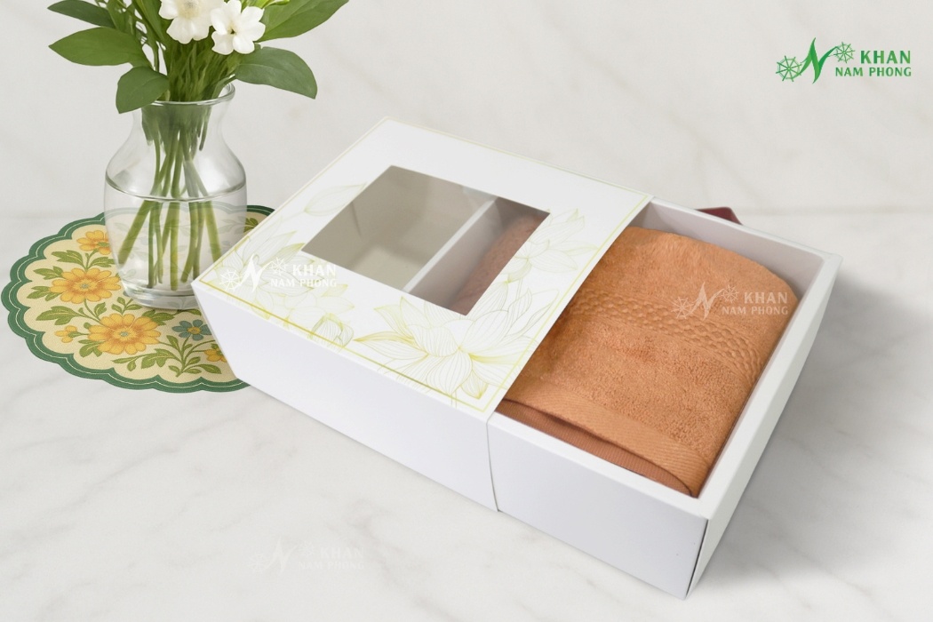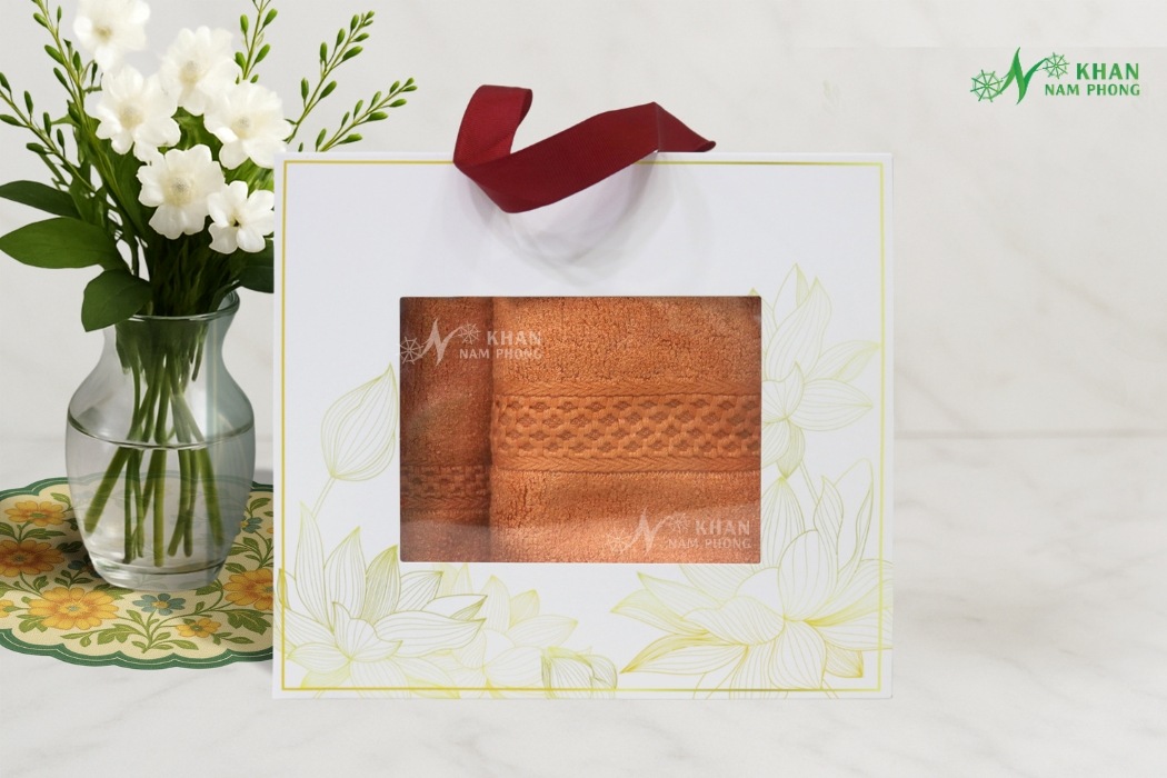 Combo 2 Khăn Quà Tặng VBamboo 28x50cm & 50x100cm Màu Cam Đất Đóng Gói Hộp Kéo Trắng