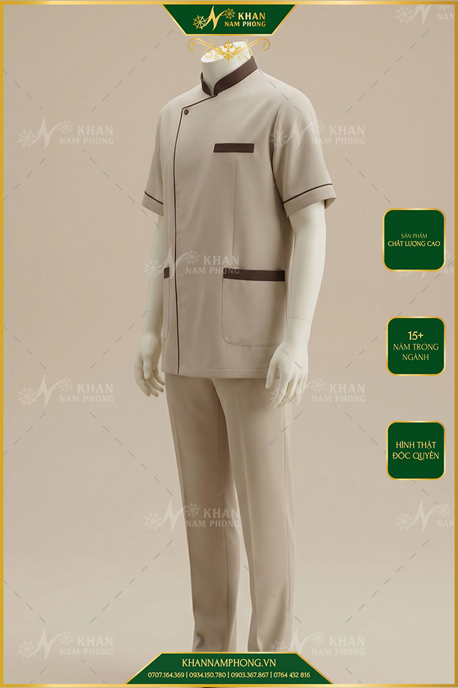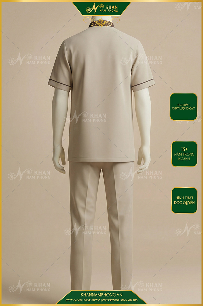 Đồng phục lễ tân nam của Khăn Nam Phong sử dụng chất liệu vải cao cấp, bề mặt mịn, đứng form, thoáng khí và ít nhăn, giúp nhân viên luôn thoải mái trong suốt thời gian làm việc dài. Thiết kế áo và quần có form chuẩn, tôn dáng nam giới, tạo cảm giác gọn gàng, chuyên nghiệp nhưng vẫn linh hoạt khi di chuyển. Màu sắc phổ biến như đen, xanh navy, xám, trắng hoặc phối màu tinh tế, phù hợp với nhiều phong cách không gian từ hiện đại đến cao cấp.