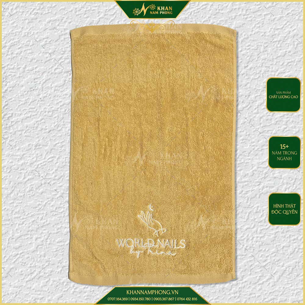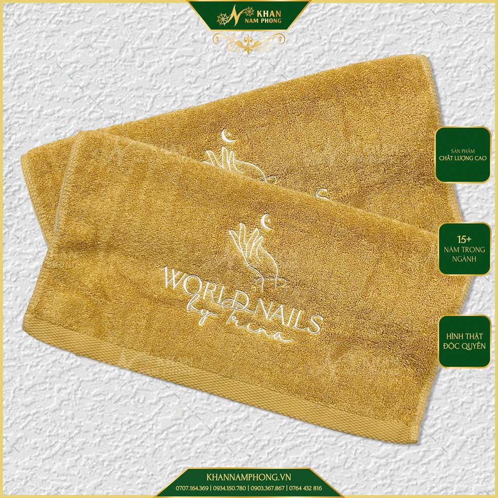 Khăn nail làm tay cotton 40x60cm thêu logo màu vàng bò là mẫu mình sản xuất cho World Nails By Trina khi cần nâng cấp trải nghiệm bàn nail và đồng bộ hình ảnh tiệm. Với kích thước lớn hơn chuẩn thông thường và chất liệu cotton nail towel thấm hút tốt, khăn giúp thao tác thoải mái hơn, đồng thời giảm tần suất thay khăn – từ đó tối ưu chi phí vận hành lâu dài.