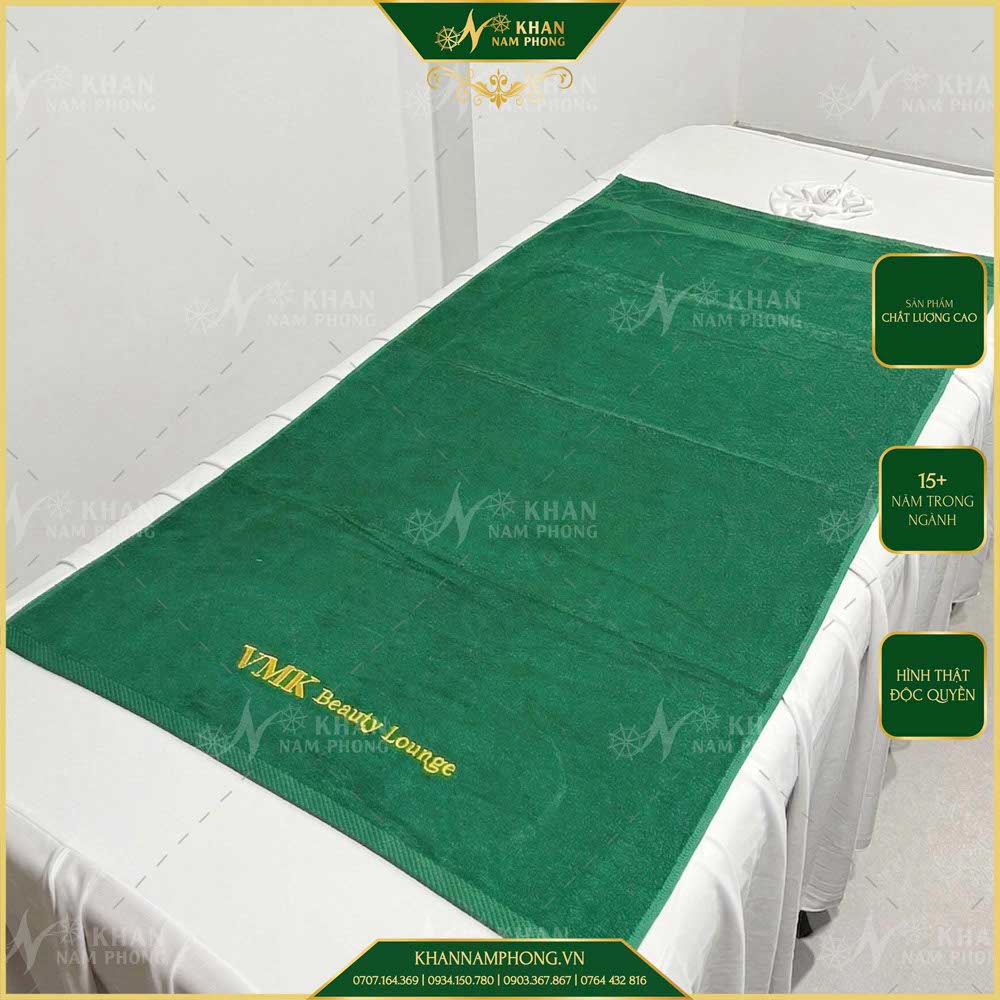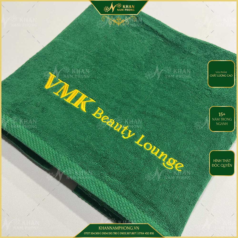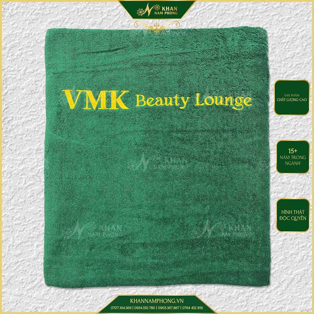 Khăn trải spa nail cotton màu xanh lá đậm thêu logo là dòng khăn mình sản xuất riêng cho VMK Beauty Lounge, tập trung vào yếu tố vận hành ổn định và đồng bộ thương hiệu. Với chất liệu cotton spa towel thấm hút tốt, bền khi giặt sấy nhiều lần, sản phẩm phù hợp cho spa, nail salon cần sử dụng lâu dài mà không phải thay khăn liên tục. Đây là lựa chọn thực tế nếu bạn đang setup tiệm hoặc nâng cấp hình ảnh dịch vụ.